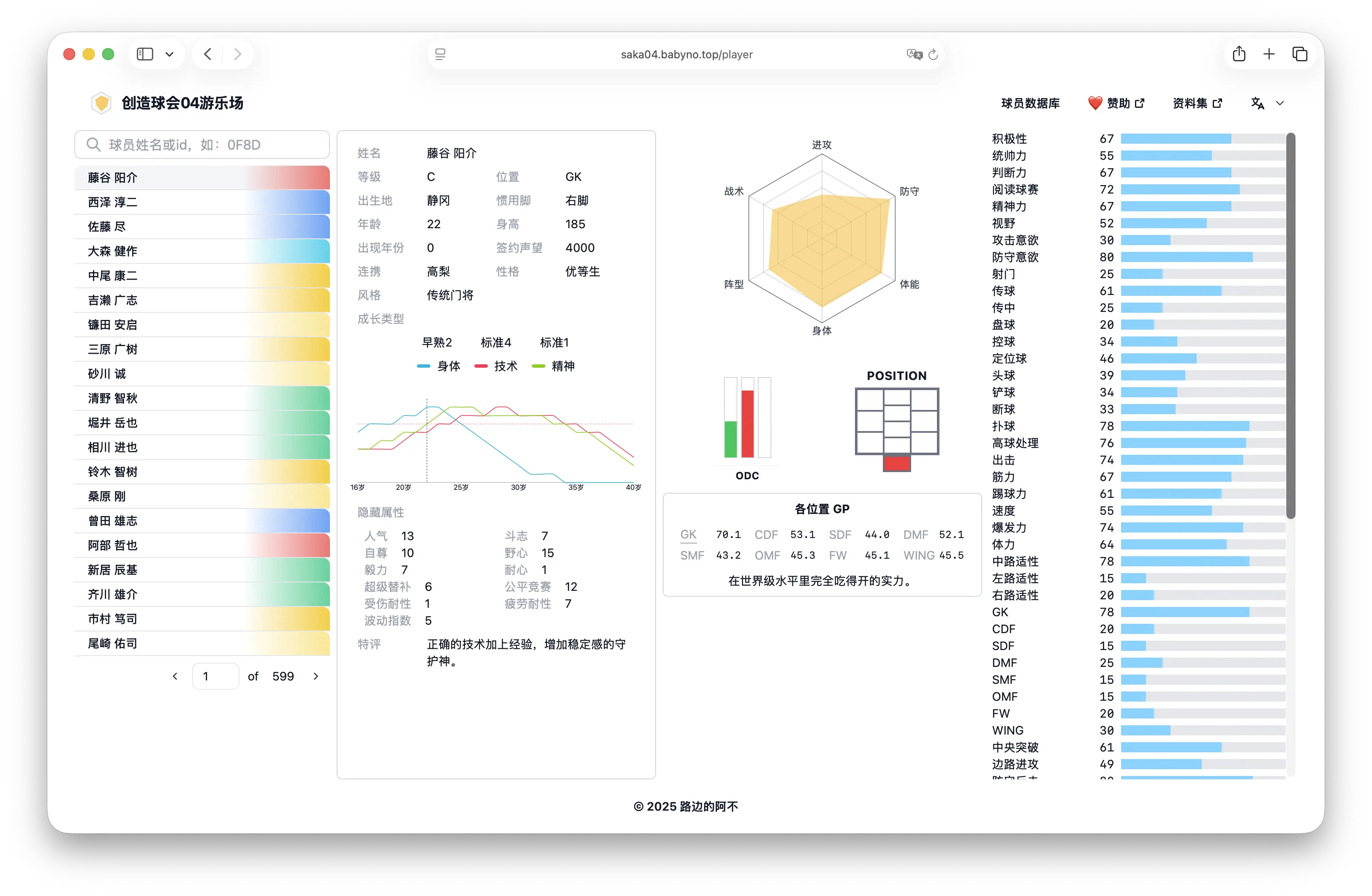 收录全部球员、球探、教练数据,支持快速检索,并提供成长类型、性格与能力的可视化分析。