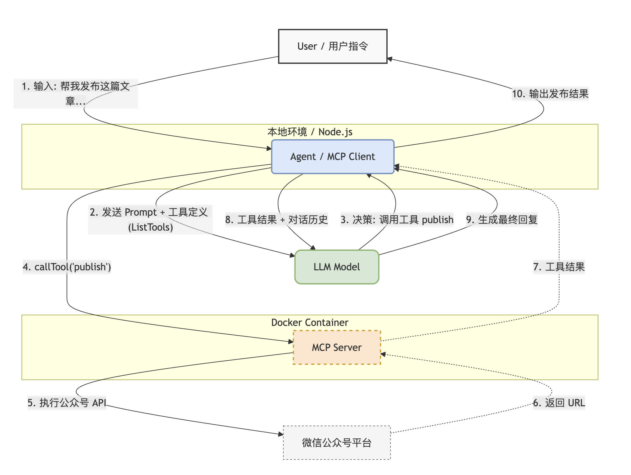 - MCP Server: 执行实际的 API 调用,转换 Markdown,上传素材,保存到草稿箱,返回结果:“发布成功,文章链接是 xxx”。