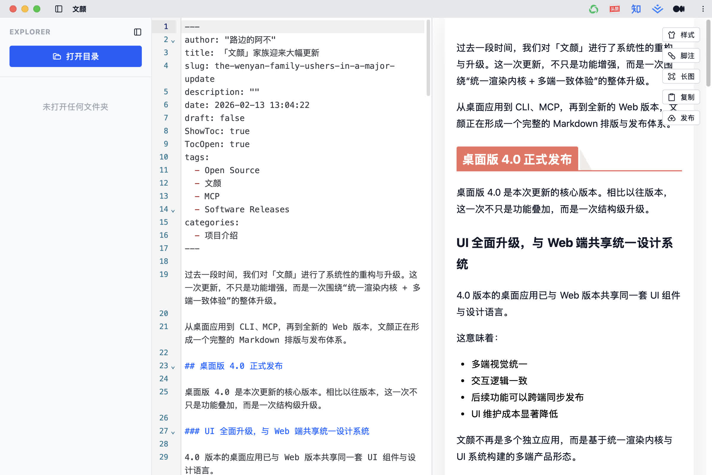 从桌面应用到 CLI、MCP,再到全新的 Web 版本,文颜正在形成一个完整的 Markdown 排版与发布体系。